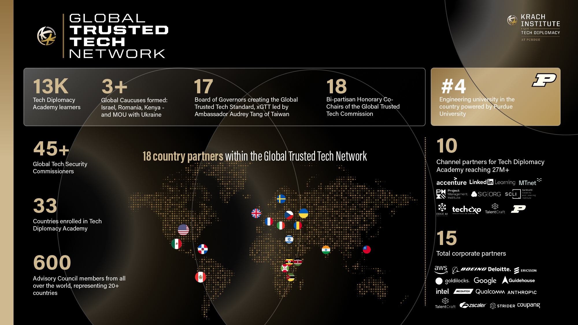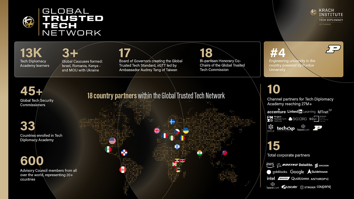 On November 17, 2025, at the fourth annual Trusted Tech Summit in Washington, DC, the Krach Institute for Tech Diplomacy at Purdue launched the Global Trusted Tech Network, the world’s fastest-growing alliance of governments, companies, individuals and institutions united around the conviction that technology must advance freedom. The Global Trusted Tech Network is built on trust and grounded in integrity, accountability, transparency, reciprocity and respect for the fundamental pillars of free societies, like respect for the rule of law, human rights, property rights, and national sovereignty. It is the organizing framework for a new era of Tech Diplomacy that recognizes the centrality of technology at the heart of the modern contest between freedom and authoritarianism.